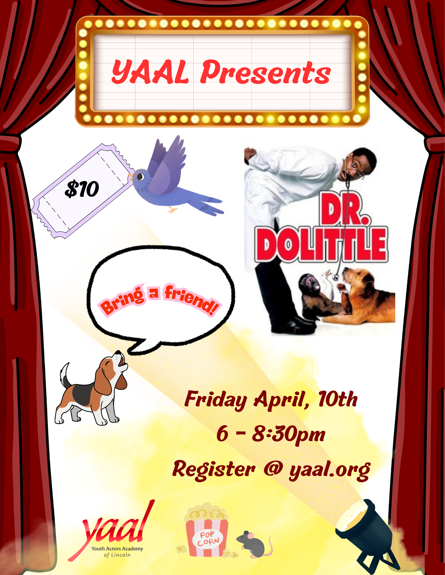 Join us for Movie Night at YAAL! We will be watching "Dr. Dolittle" in preparation for our upcoming summer main stage production of Dr. Dolittle Jr.!