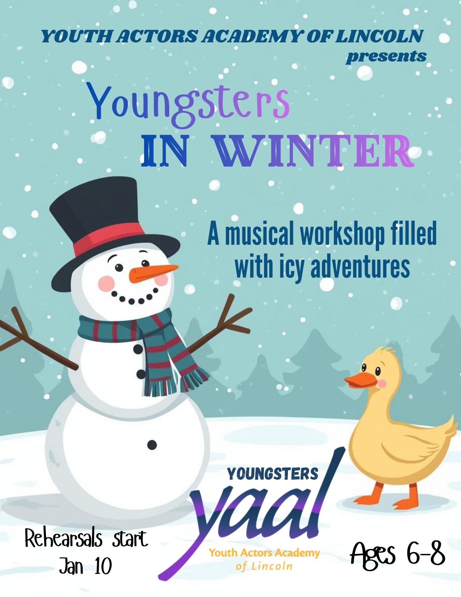 A musical workshop featuring playful, high-energy songs that feel like a swirling winter blizzard! Designed especially for YAAL’s youngest students, this workshop offers a joyful first step onto the stage, with opportunities to act, sing, and dance in a fun, supportive environment. Through creative movement, music, and imagination, students will build confidence while bringing a cheerful snowman story to life. After all—what’s better than building a snowman in winter?